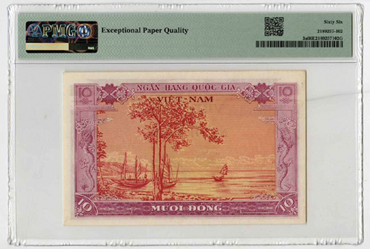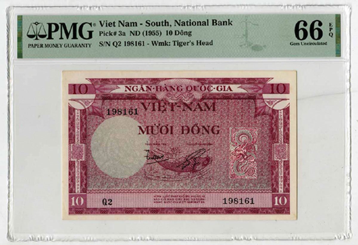 Vietnam - South, ND (1955). 10 Dong, P-3a, Issued Banknote, Deep red on blue and gray underprint, Fish at center, S/N Q2 198161, PMG graded Gem Uncirculated 66 EPQ.