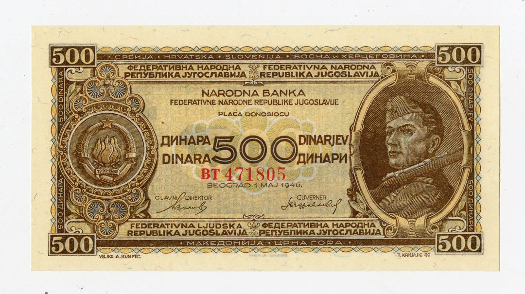Yugoslavia…., 1946. 500 Dinara, P-66a, Issued Banknote, Brown on m/c underprint, Arms at left and soldier with rifle at right, Back is brown on m/c with farmers plowing field with horses at center, S/N BT 471805, AU-Uncirculated Condition.
