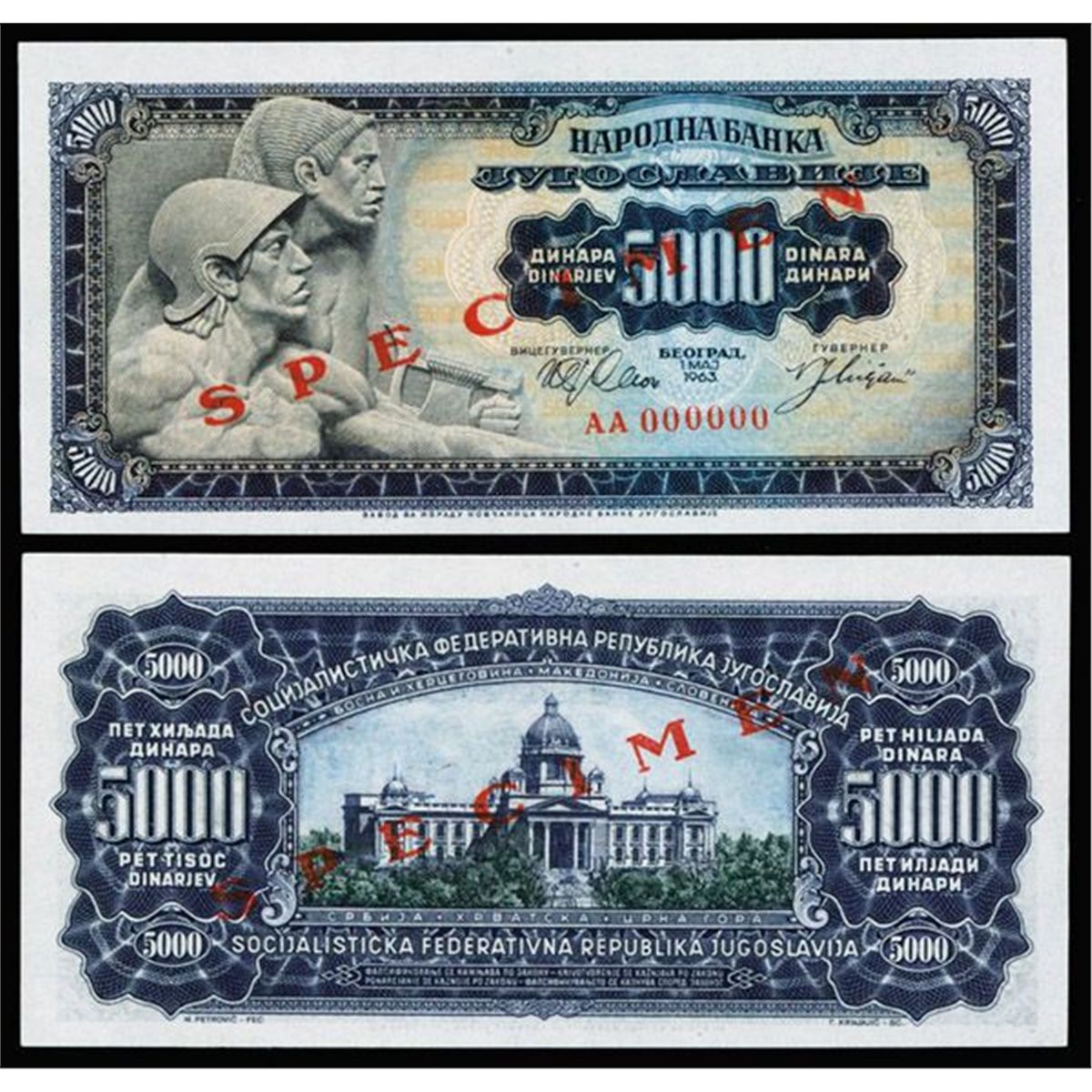 Yugoslavia, 1963. 5000 Dinara, P-76s, Specimen banknote, Dark blue on m/c, Red Specimen overprint, “AA 000000”, Uncirculated with slight rounding on top right corner otherwise an exceptional appearing note that is underrated.