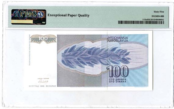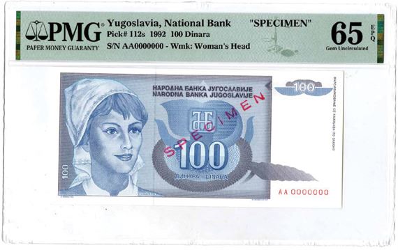 Yugoslavia, 1992. 100 Dinara, P-112s, Specimen Banknote. Grayish purple on pink and pale blue underprint with young woman at left. S/N AA0000000 with watermark of woman's head. PMG graded Gem Uncirculated 65 EPQ. Unlisted as a specimen in the Standard Catalog. Only 3 notes have been graded in the PMG census.