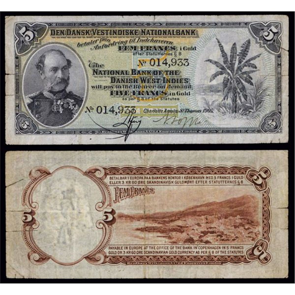 St. Thomas, DWI., 1905, 5 Francs in Gold, P-17, Issued banknote, Black on green, gray and orange, King Christian IX at left, palm tree at right, back brown, S/N 014,933, the note appears Choice Fine with mounting remnants on back and 3 very small splits on the right and left side margins just touching design, BWC. Rare banknote in any condition and rarely seen issued.