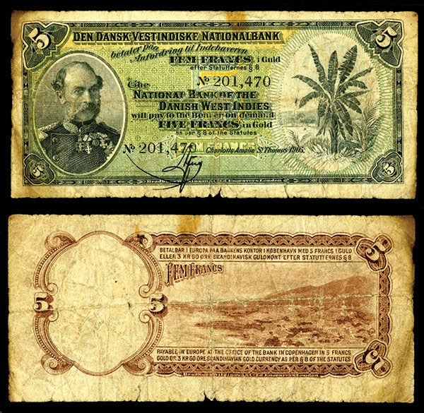 St. Thomas, DWI., 1905, 5 Francs in Gold, P-17, Issued banknote, Black on green, gray and orange, King Christian IX at left, palm tree at right, back brown, S/N 201,470, PMG graded Fine 12 NET with note of tears and staining on left border area. Rare banknote in any condition and rarely seen issued.