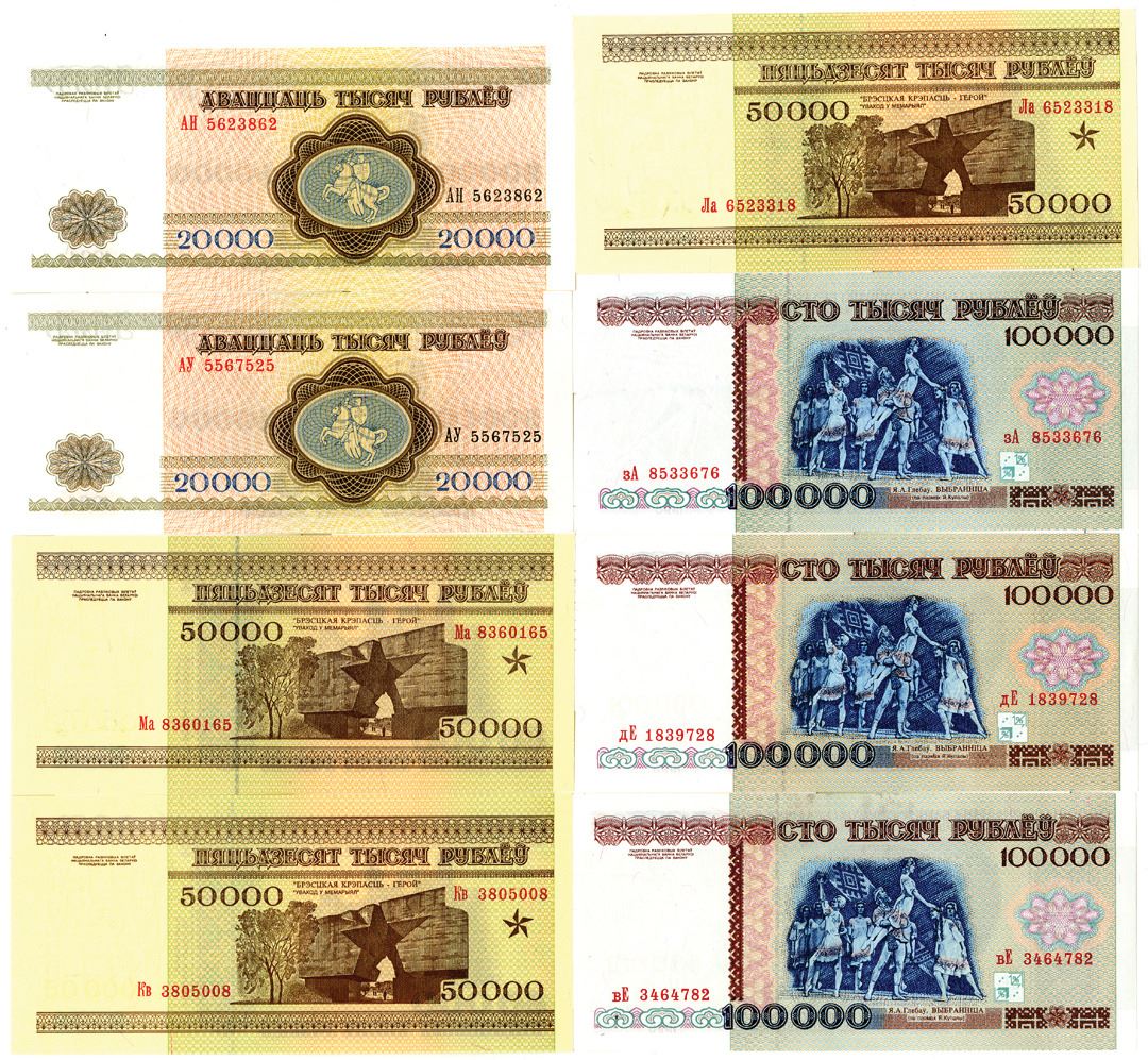 Belarus. 1994. 20000, 50000, and 10000 Rublei, P-13 (2); 14 (3); 15 (3), issued banknote octet, Unc (8).