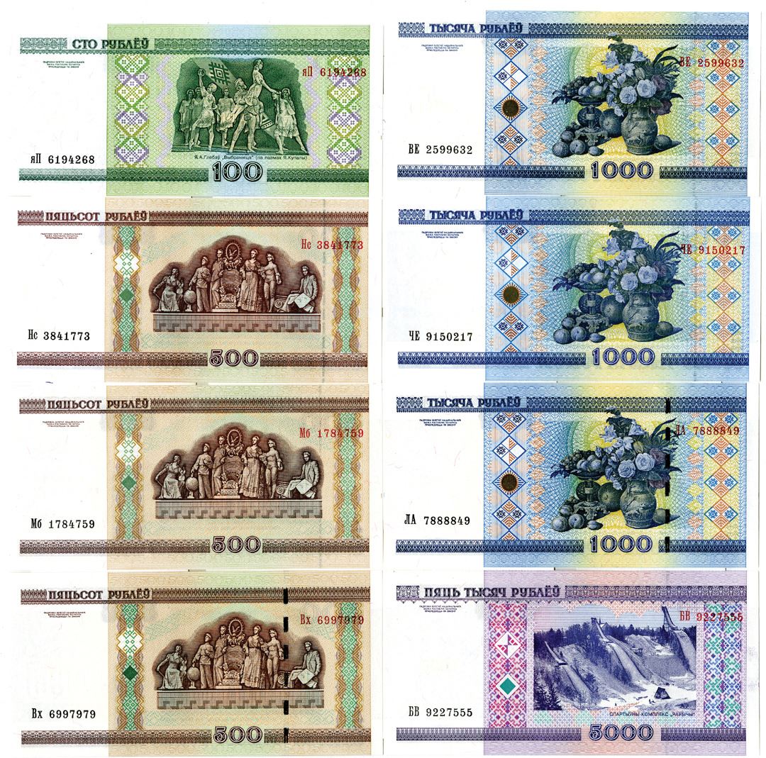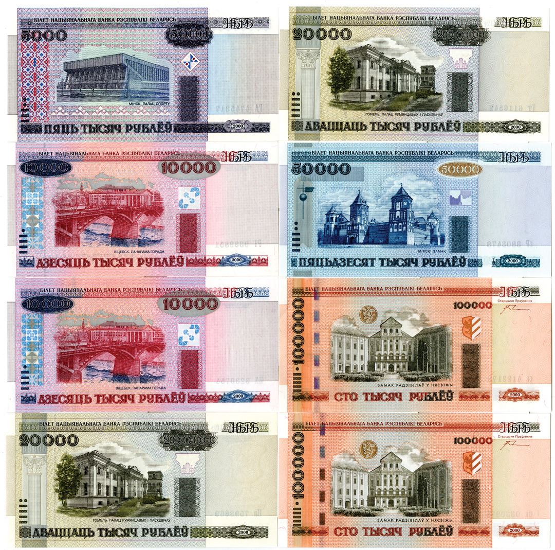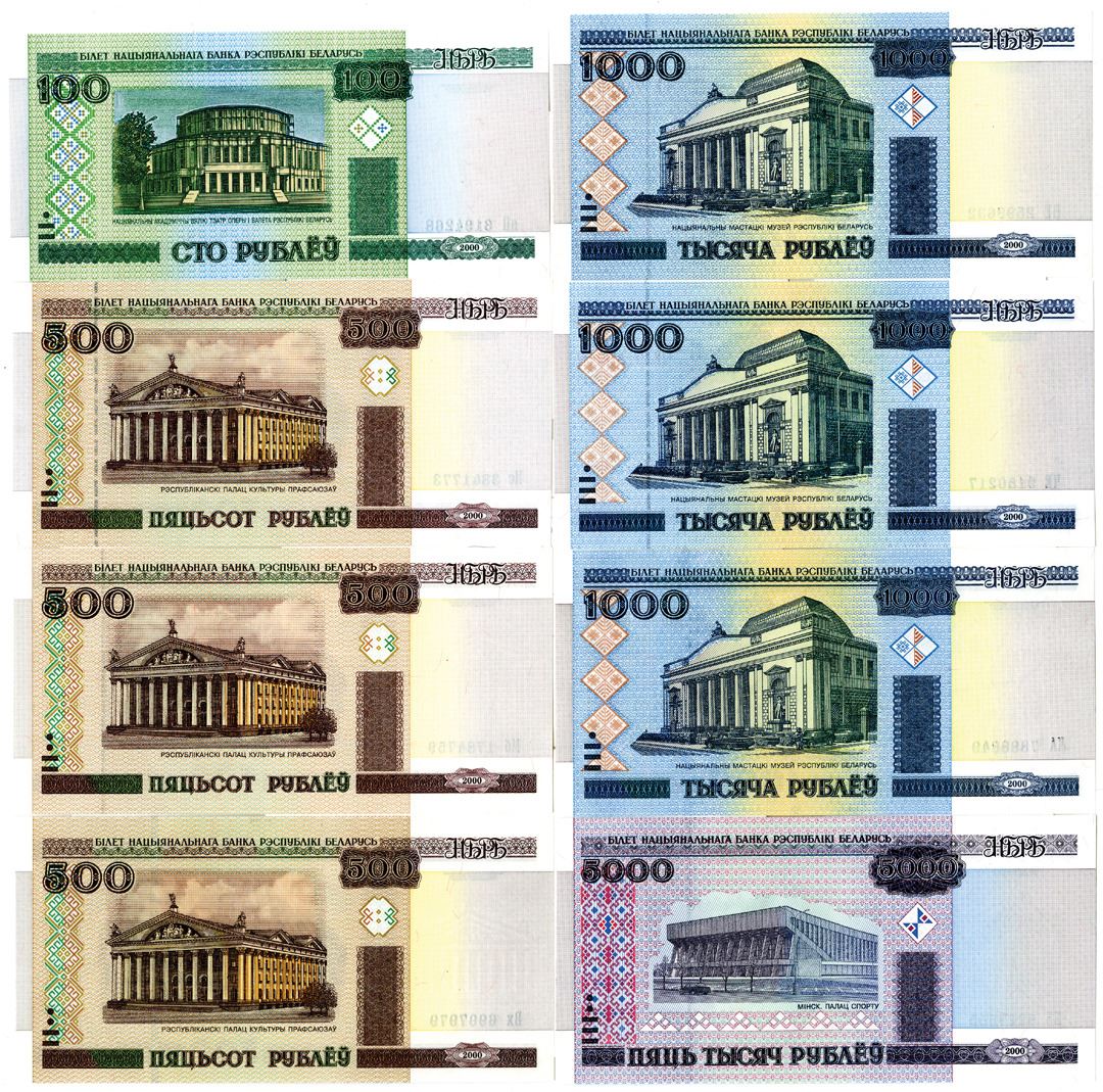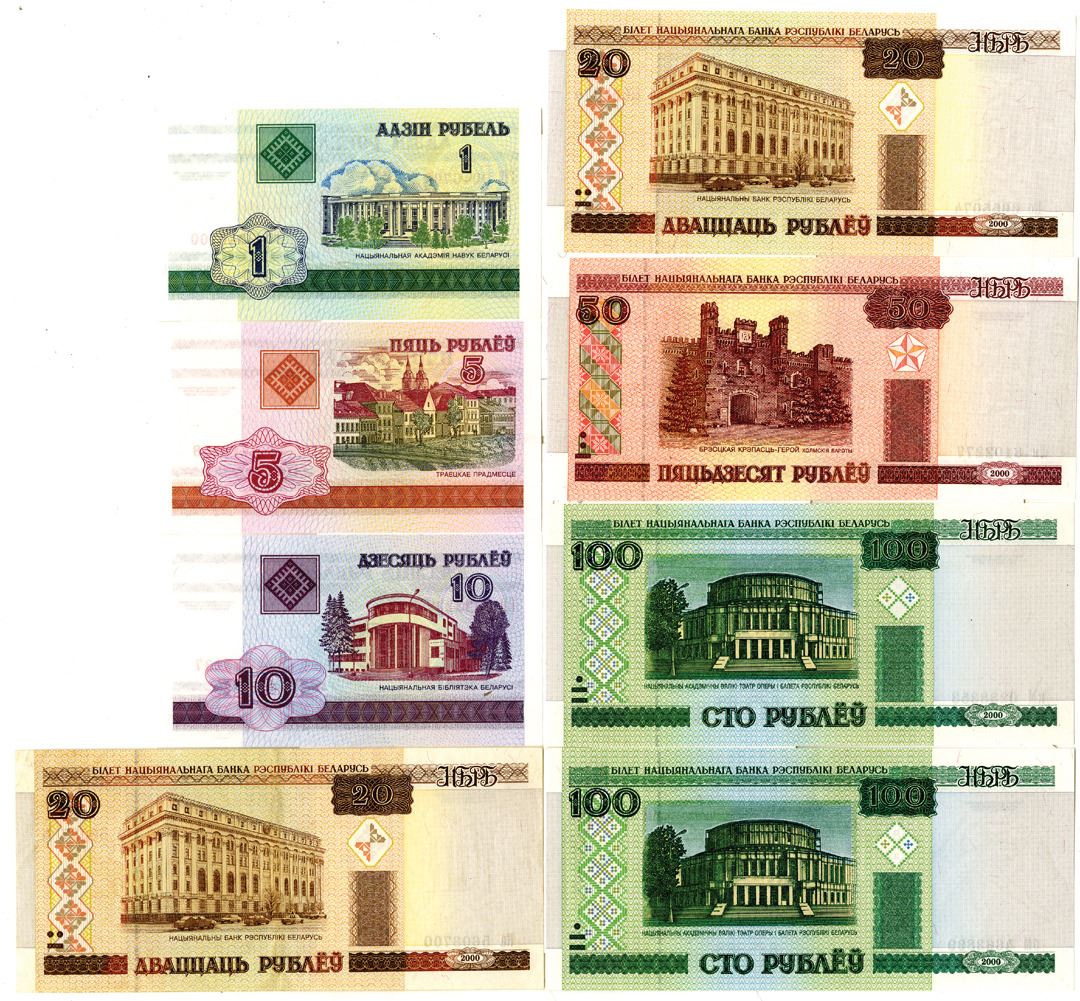 Belarus. 2000. 1, 5, 10, 20, 50, 100, 500, 1000, 5000, 10000, 20000, 50000, and 100000 Rublei, P-21; 22; 23; 24 (2); 25; 26 (3); 27 (3); 28 (3); 29 (2); 30 (2); 32; 34 (2), issued banknote group, AU to Unc (24).