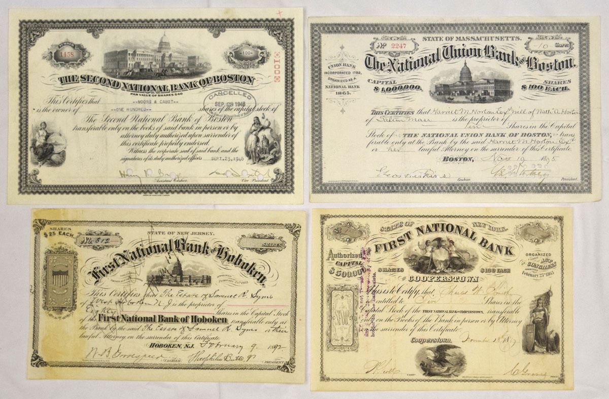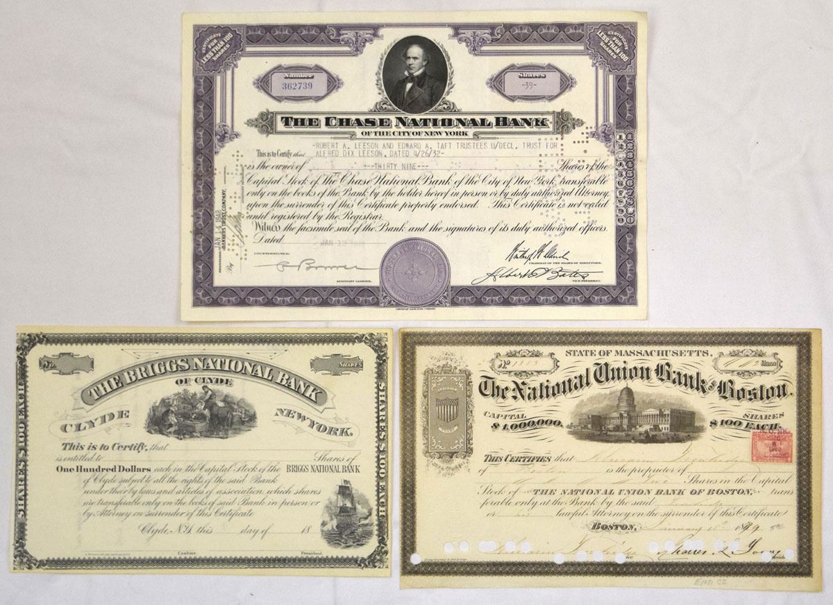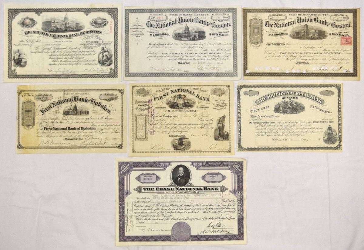 Various States...., Lot of 7 stock certificates representing early American national banking institutions. Includes: Second National Bank of Boston; National Union Bank of Boston (2); First National Bank of Hoboken; First National Bank; Briggs National Bank of Clyde; and Chase National Bank of the City of New York. Certificates feature detailed engraved vignettes, ornate borders, period typography, and manuscript signatures, with revenue stamps, cancellations, or endorsements present on select examples. Conditions range from VG to XF overall, with typical folds, handling wear, light staining, edge wear, and occasional punch cancels or annotations. (7). Sold “AS IS” no returns accepted.