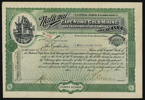 Alaska. 1900. Issued and Uncancelled. 1000 Shares. Cert.#260. Green border with light green underprint, Large mining contraption on upper left with ornate title. Mines located at Cape Nome, Alaska. XF condition. Rare, early and attractive Alaska mining certificate.