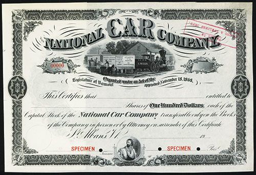 Vermont, 19xx, Odd Shares, Specimen Stock, Black ornate border with vignette of freight car being loaded, Red SPECIMEN overprint POC's and red s/n “ 00000” , Continental BNC.
