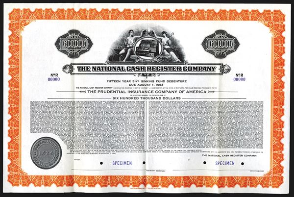 MD. $600,000 Specimen 3 1/4% Registered Bond made out to Prudential Insurance Company of America, Black on orange with cash register flanked by allegorical figures on top, VF, Specimen overprints, POC's, FLD-ABNC. Rare denomination as well as company.