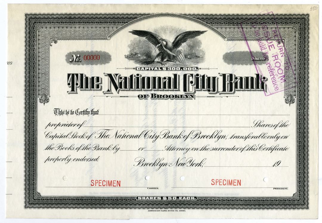 New York, ca. 1910-20s. Odd Shares Specimen Capital Stock Certificate, Black text with black border, Eagle with shield and banner at top center. Red specimen overprints, Return to Issue Room handstamp at top right corner, 00000 serial number, and POCs. Fine to VF condition with a small tear on the top right excess margin, ABNC.