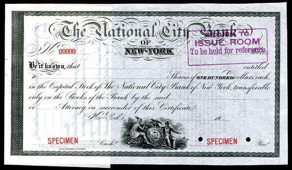 New York. Specimen Stock. Black print with ornate black border and State Seal bottom center. POC's and red SPECIMEN overprints. VF-XF condition. ABNC. Rare earlier stock certificate version.
