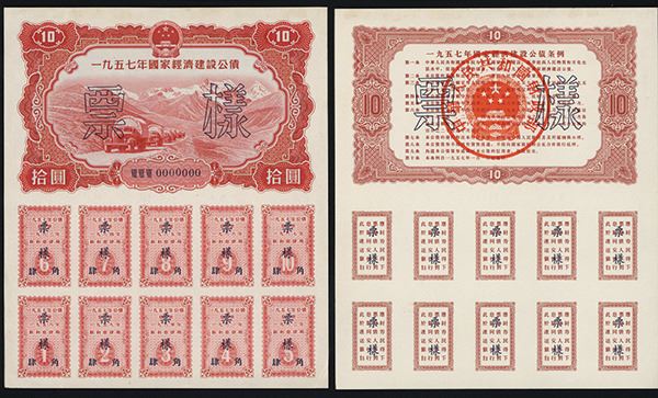 1957. 10 Yuan, P-UNL. Uniface specimen face and back. Printed on white paper. Front red with truck caravan in mountains, back orange brown with red overprint. Both front and back have 2 Chinese character overprints in black and front has "000000" serial numbers. The reverse of each has control numbers printed. Coupons attached to the bottom. Both in XF+ to AU condition. Small format and possibly circulating bonds. Scarce modern specimen.