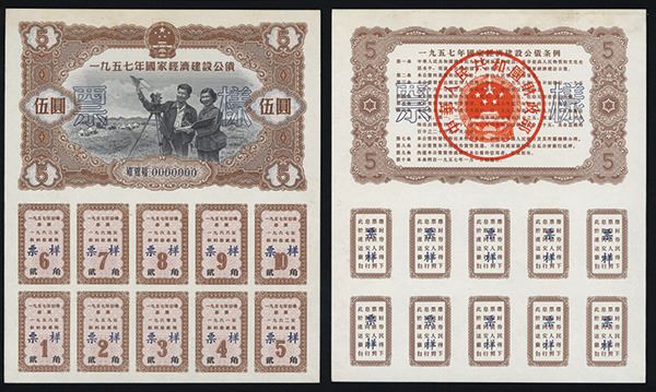 1957. 5 Yuan, P-UNL. Uniface specimen face and back. Printed on white paper. Front black and brown with man and woman surveyors, back brown with red overprint. Both front and back have 2 Chinese character overprints in black and front has "000000" serial numbers. The reverse of each has control numbers printed. Coupons attached to the bottom. Both in XF+ condition with wavy paper (no bends). Small format and possibly circulating bonds. Scarce modern specimen.