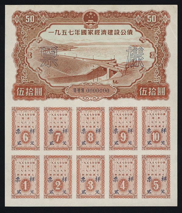 1957. 50 Yuan, P-UNL. Uniface specimen face and back. Printed on white paper. Front orange-brown on light blue underprint with dam and lake, back brown with red overprint. Both front and back have 2 Chinese character overprints in blue and front has "000000" serial numbers. The reverse of each has control numbers printed. Coupons attached to the bottom. Front in XF and back in AU condition. Small format and possibly circulating bonds. Scarce modern specimen.