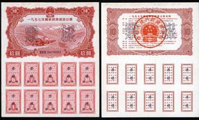 1957. 10 Yuan, P-UNL. Uniface specimen face and back. Printed on white paper. Front red with truck caravan in mountains, back orange brown with red overprint. Both front and back have 2 Chinese character oveprints in black and front has "000000" serial numbers. The reverse of each has control numbers printed. Coupons attached to the bottom. Both in XF+ to AU condition. Small format and possibly circulating bonds. Scarce modern specimen.