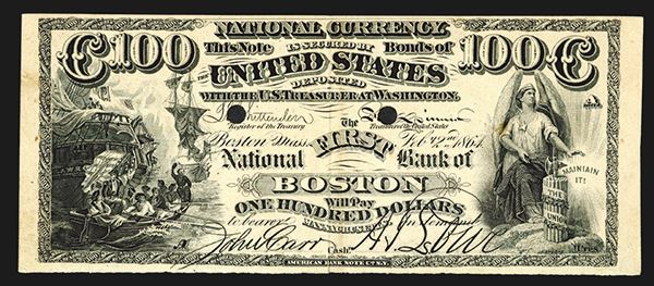 National Currency $100. First National Bank of Boston. Counterfeit detector page, folded. POC. Formerly part of a Counterfeit Detector book of the era. Uniface.