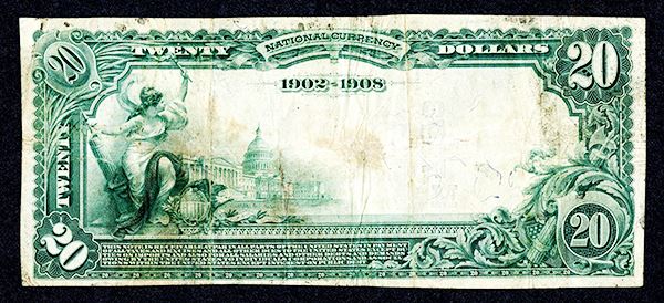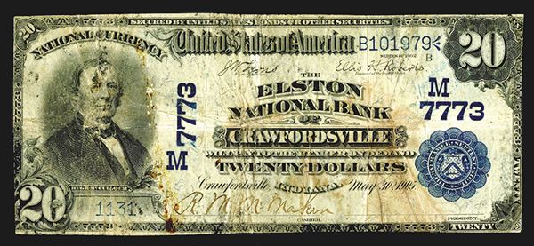 IN. National Currency. Elston National Bank of Crawfordsville. #7773. $20 Date back, blue seal. Fr. 642 Lyons-Roberts signatures. Four known on the bank, this is the lowest serial #. Good. Margins cut tight, rubber band damage at left.
