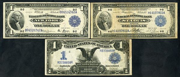 New York and Missouri. National Currency, $1 pair, one New York, VF, and one St. Louis, Fine. Also included $1, 1899, "Black Eagle", Fine.