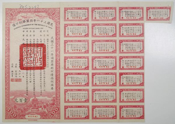 China, 1942. $100 I/U Allied Victory Coupon Bond in English and Chinese, Black text with red border and undertint, Chinese building illustrated at bottom. Fine condition, coupons at right.