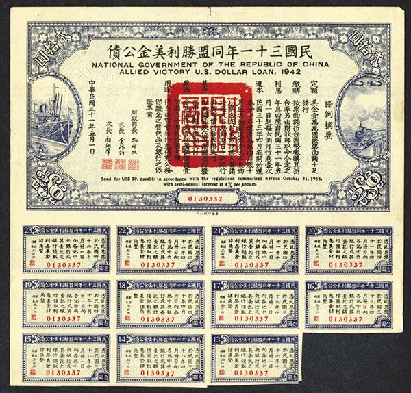 China, $20, Issued and uncancelled bonds, 11 coupons attached, Blue with ship and train with large red seal in middle, back blank, VF to XF. Scarce type.