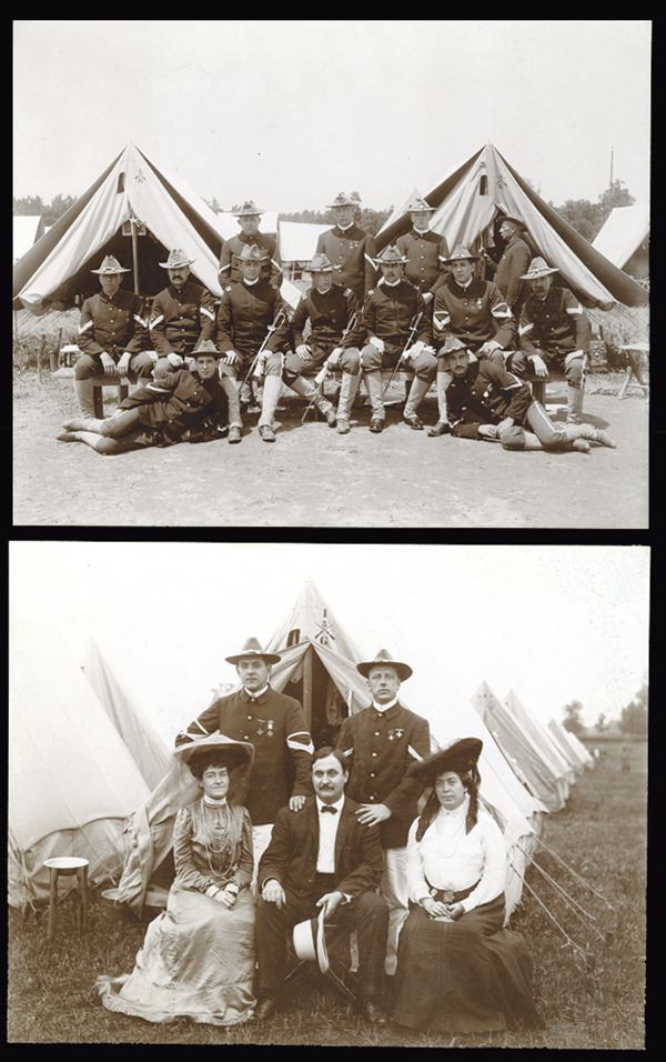 Two images, one with 13 men (3 with swords) outside of two tents with 5G and crossed rifles. The other image has two of the men in the first photo with two women and a civilian. This ten has a large 1 above the 5G marking. Images on 9-1/2 x 7-1/2 mounted on larger board. Very sharp images. 2 pieces.