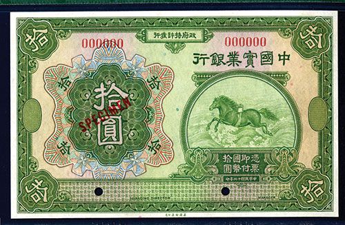 China, 10 Yuan, P-527s (S/M#C291-3), Specimen banknote, Green on m/c, Running horse on ocean on right, back green, Specimen overprints, POC's, PMG graded Gem Uncirculated 66 EPQ (Exceptional Paper quality), rare note in this grade with only two notes graded higher in the PMG census. ABNC.