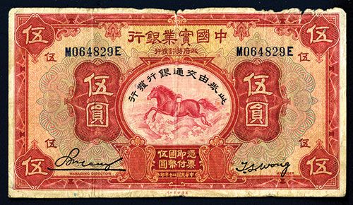 China, 1931, 5 Yuan. P-532r, (S/M#C291-11)., Remainder, Red on m/c, Running horse on face, bank building on back, S/N M064829E, ABNC. Choice Fine to VF with small split on top middle margin and small edge faults on upper border, otherwise an attractive note.