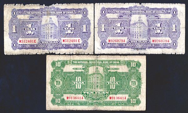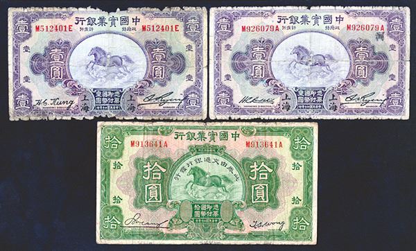 China, Republic. 1, 10 Yuan. P-S531b; S531c; S533b. Horse galloping the sea waves at center. Very Good, rough edges on all. 3 pieces.