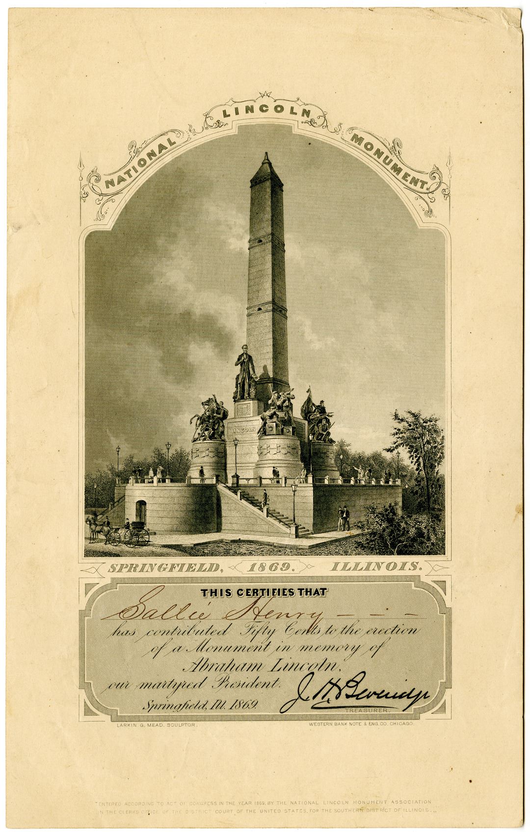 Springfield, Illinois, 1869. Issued Contribution Certificate for the erection of a Monument in memory of Abraham Lincoln, "our martyred President," for the sum of $0.50, donated by Sallie Henry. Black text with a depiction of the Lincoln Tomb at center, Fine condition with slight signs of age. On April 15, 1865, the day President Lincoln died, a group of Springfield citizens formed the National Lincoln Monument Association and spearheaded a drive for funds to construct a memorial or tomb. The subsequent Lincoln Tomb was established, serving as the final resting place of the 16th President of the United States, Abraham Lincoln; his wife, Mary Todd Lincoln; and three of their four sons, Edward, William, and Thomas. It is located in Oak Ridge Cemetery in Springfield, Illinois. Constructed of granite, the tomb has a single-story rectangular base, surmounted by an obelisk, with a semicircular receiving room entrance-way, on one end, and semicircular crypt or burial-room opposite.