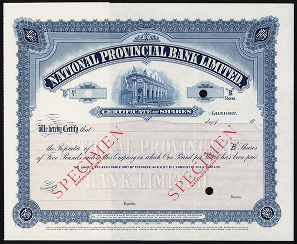 London, England, 19xx (ca, 1910-20), Odd "B" Shs, Specimen certificate, Blue on light brown, Bank building in middle, Specimen overprints, POC's, Waterlow & Sons.