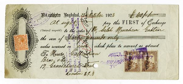 Baghdad, Iraq. Issued check for 40 Pounds Sterling, dated 23-October-1923, payable to a Mr. Saleh Menachem Gahtan, with various endorsements and counter stamped as well as 3 affixed revenue stamps. Some foxing. Very Fine.