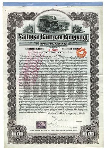 Mexico. $1000 I/U 4 1/2% Prior Lien Gold Coupon Bond, Black print on black/purple border and under tint, Locomotive crossing bridge with man on horseback beside it, VF-XF condition, IBNC.