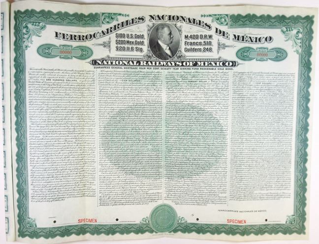 Mexico. $1,000 Specimen 4% Guaranteed General Mortgage Sinking Fund Redeemable Gold Coupon Bond. Black ink with green border and under print. Vignette of Porfirio D’az, former President of Mexico, at top. Bond is in English, Spanish, German, and French. Specimen overprints, POC's, VF-XF condition with all coupons intact. ABNC.