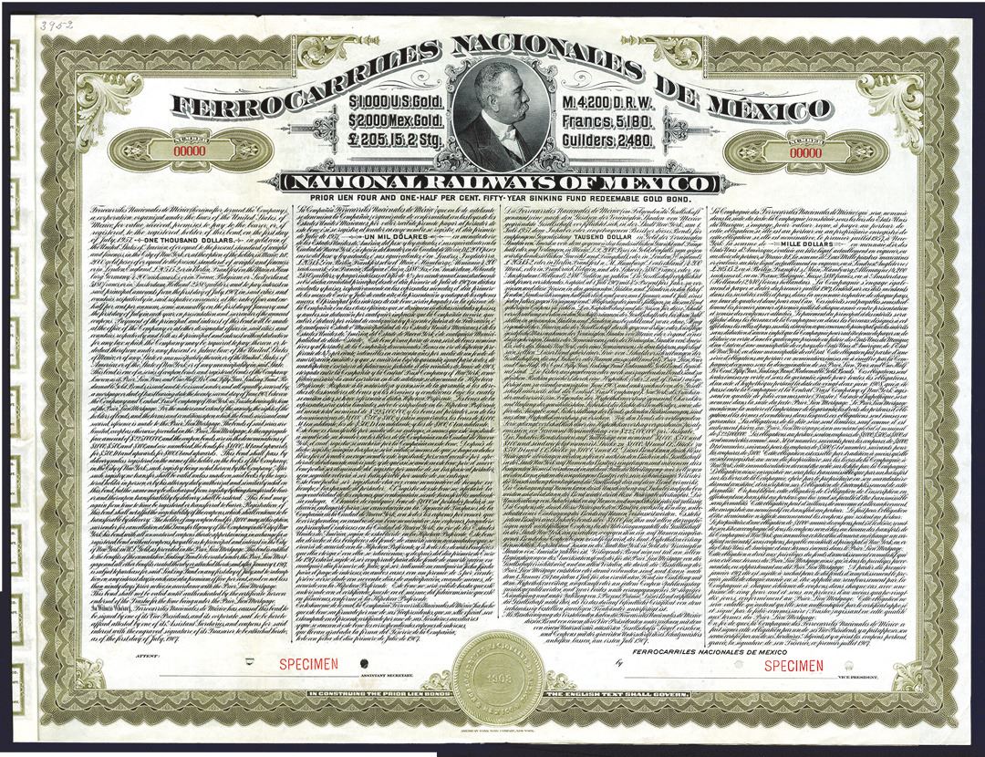 Mexico, 1907, $1000, 4 1/2% Prior Lien 50 Year Sinking Fund Redeemable Gold Specimen Bond, Horizontal format, Coupons attached, Black on brown border and underprint, Portrait of man top center, POC's, VF condition, ABNC.