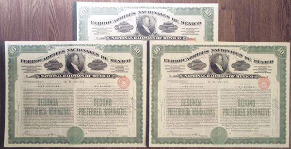 Mexico, 1907. 3 pieces, all are: 10 Shares I/U Second Preferred Stock Certificate, Black text with green border and underprint, Profile of Porfirio Diaz at top center. XF condition with coupons attached, ABNC. (3)