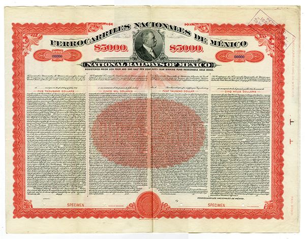 Mexico. $5,000 Registered 4 1/2% Specimen Prior Lien Fifty Year Sinking Fund Redeemable Gold Bond, Black print on red border and under tint, Printed in English, Spanish, German, and French, Vignette of Porfirio D’az (Mexican General and Political who served seven terms as President of Mexico, a total of 31 years) at top, Specimen overprints and POC's, VF-XF condition, ABNC.