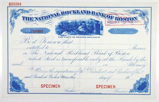 Massachusetts, ND (1900-1920s). Specimen Stock Certificate, Navy text with border, no underprint, Illustration of Santa leaving a roof at top. Red specimen overprints, "00000" serial number, POC's, and Return to Specimen Department stamp at top right corner, XF condition, Printed by ABNC. Popular Santa vignette.