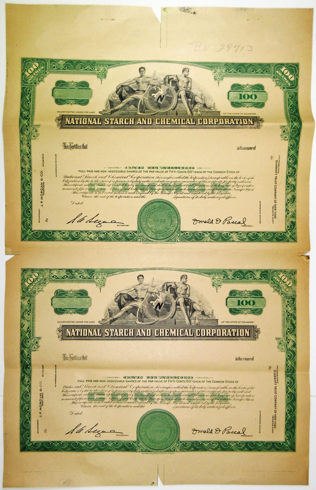 DE. Uncut sheet of 2 stock certificates, Black on green border and underprint printed on light orange-brown paper, borders with alignment notches, VF condition due to archival storage. SCBN. Unique as uncut sheet.