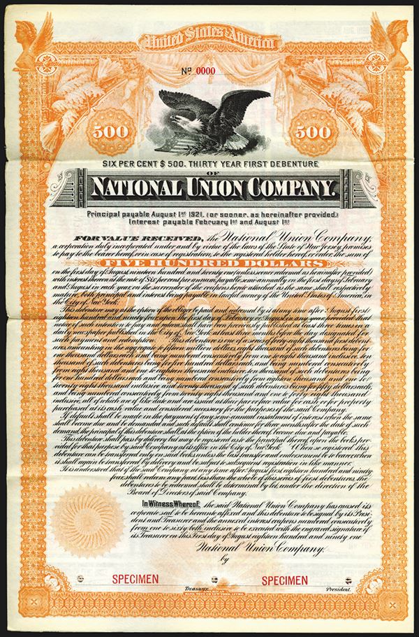NJ, $500 Specimen 6% Coupon Bond, Black on orange border and underprint, Eagle and shield on top, VF, ABNC.