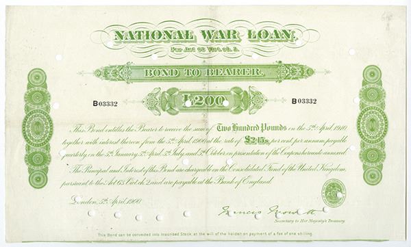 London, 1900, £200 Pounds, bond to bearer. All green. No.B03332. VF, punch cancelled. Payable at the Bank of England, Rare and desirable