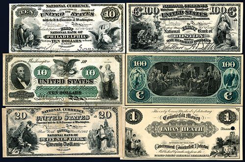 Lot of 9 pieces, 5 fronts and 4 backs, all ca.1860-70, Includes $10, 1864, First National Bank of Philadelphia face; $20, 1864, Fourth National Bank of the City of New York face with matching back; $100 , 1864, First National Bank of Boston Face with 2 backs and additional items, all Fine to XF, all of the note plates are from different counterfeit detectors. Attractive reference collection. ABN and NBN.