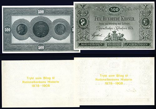 Copenhagen, Denmark, 1875 (1920 reprint), 500 Kroner, P-A84 Type Unlisted reprint, Uniface Obverse and reverse with text on back of each note “Trykt Som Bilag til Nationalbankens Historie 1878-1908”, Choice AU to Uncirculated with mounting remnants on face. The note is taken from (E) Rubow: “ National Bank's history 1878-1908 “, Copenhagen 1920.