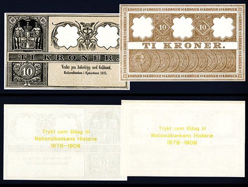 Copenhagen, Denmark, 1911 (1920 reprint), 10 Kroner, P-7k Type Unlisted reprint, Uniface Obverse and reverse banknotes with text on back of each note “Trykt Som Bilag til Nationalbankens Historie 1878-1908”, Choice AU to Uncirculated with mounting remnants on face. The note is taken from (E) Rubow: “ National Bank's history 1878-1908 “, Copenhagen 1920. Supposedly printed by the bank from the original plates.