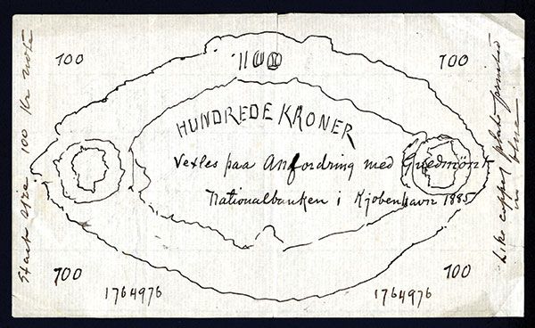 Denmark, unique and unadopted hand-executed concept essay for a 100 Kroner note from 1885, during the reign of Christian IX. At that time, 100 Kroner was the largest denomination in circulation. We know of two issued 100 Kroner notes from that period, the first being the 1875-87 issue, P-A83, unpriced in the catalog, while the second is the 1888-1902 issue, P-4, valued at $12,000 in Fine condition. The note being offered is neither of these but is of important significance to any serious Denmark and Scandinavian collectors as it was from the same period and for the same denomination. The pen-drawn piece features the denomination in the top center as well as each corner, with a stylized frame. VF with small tear near top center line. Unique and should see spirited bidding. ABNC.