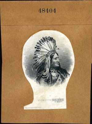 ca.1870's-1930's. 10 different vignettes of Native American Chieftens and Braves used on stocks, bonds, checks, Traveler's Checks and security printed documents. The vignettes range from 1 to 3 inches in size. All are printed on india paper and mounted to manila file cards. Titles include "Hendee Manufacturing" (they manufactured the famous "Indian Motocycle" and this is their logo; "North American Refractories" used on their stock certificate; "The National Shawmut Bank" with this being their logo and others titled and untitled. Printers include ABNC (7); NBNC (2) and FBNC (1). Condition ranges from VG to choice uncirculated condition. Please inspect. ABNC, WBNC, FBNC.