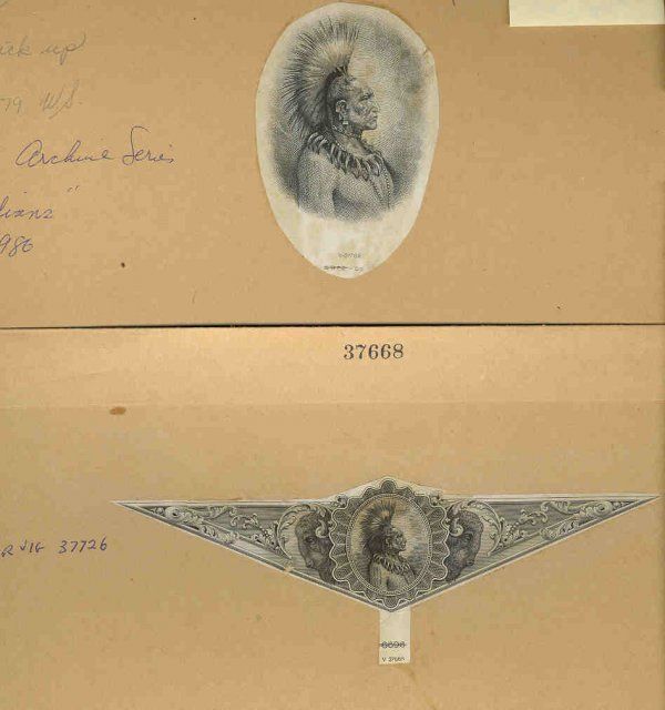 ca.1880's-1900. 5 different proof vignette versions of Native American "Mohawk" in profile. All are printed on india paper with 4 mounted on manila file folders or cards. All are printed by western BNC. 4 different sizes and formats with one flanked by 2 bison. The others are in various sizes in ovals. The large vignette folder has notation "Used on 1986 Archival Series Indians". Mostly choice condition with some minor toning. Rare assortment. WBNC.