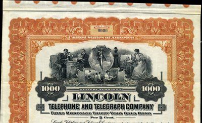 1916. $1,000. Specimen 1st Mortgage 5% Gold Bond. Orange border. Ornate vignette of businessmen speaking, telegraph machine, operators placing calls and workman on telephone pole. Red specimen overprints, POC's and "00000" serial numbers. Coupons attached. XF condition. Rare and attractive telegraph bond. WBNC