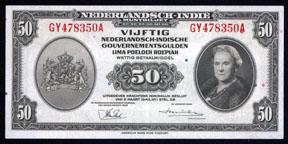 Lot of 6 notes. All are 1943 Issues. Includes 3 examples of 5 Gulden, P-113a, blue face with Queen Wilhelma on right and arms on left and 3 examples of 50 Gulden, P-116a, olive green with Queen Wilhelma on right and arms on left , both denominations with green back with plane and pilot, soldier and warship. Condition is XF to AU with light to extremely light vertical middle folds keeping the notes from Unc. Attractive grouping of these issues. ABNC.