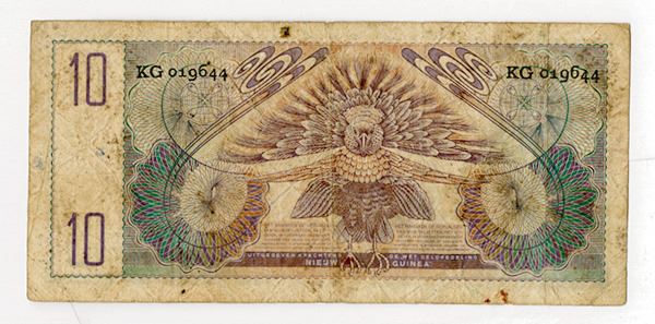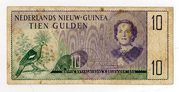 Netherlands New Guinea, 10 Gulden, P-14a, issued note, purple and green, Queen Juliana at right, pigeon at left, back purple and brown, Fine to Choice Fine with toning and small toning spots. Scarce note in any condition.