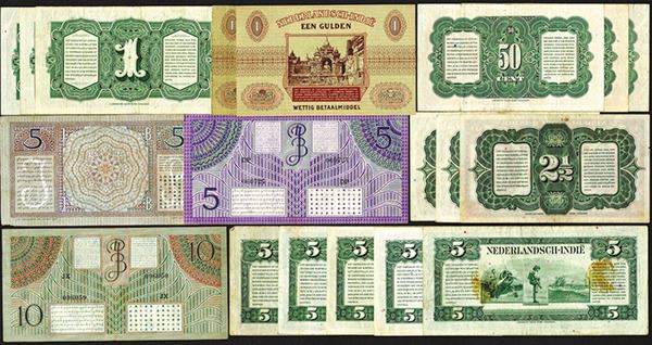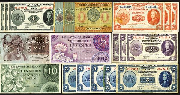 Netherlands Indies. SCWPM 78c (last date of type), 87, 89, 108a (2, one as short snorter); 110a (3), 111a (3), 112a (3), 113a (5, as short snorters). A few with tape residue. Mostly Very Good-Fine. 19 pieces