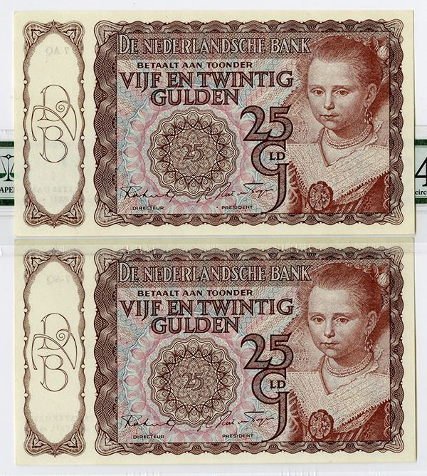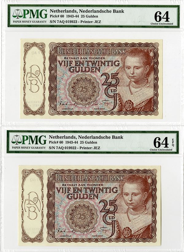 Netherlands, pair of 25 Gulden, P-60, sequential S/N 019922-0119923, PMG graded Choice Uncirculated 64 EPQ and Choice Uncirculated 64, respectively. JEZ. Unpriced above XF.